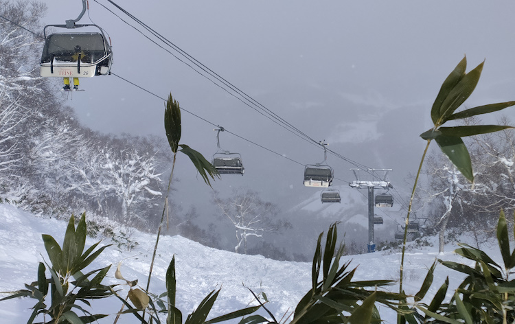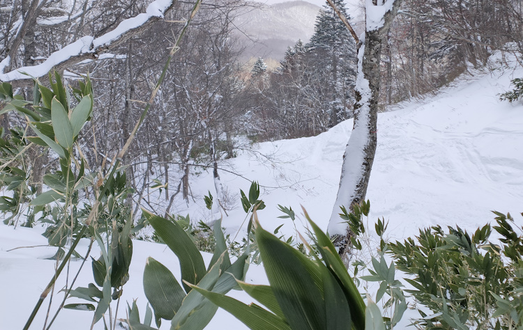 In the summer, those leaves blend in with the rest of the engrossing green. But in winter, with the white spilling off in all directions, the green leaves create quite a contrast. The local variety is called “dwarf bamboo;” it’s thigh-high, not tall at all. There is no “cane” to it; it’s short and scrubby, but the leaves are unmistakable. All this green will be buried in most places by mid-January, but this early in the season the bamboo is part and party to the landscape, and for a westerner; bamboo is a shocking sight on a ski hill.