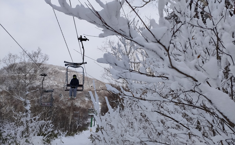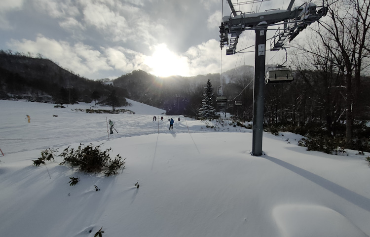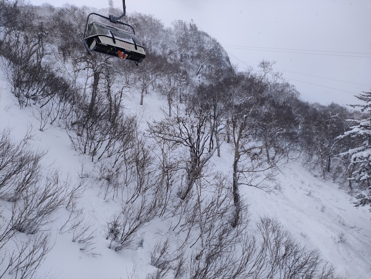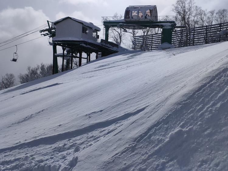 The sign at the top of the lift said: -10 C. I dialed in what to wear long ago; at this point, wearing the same outfit (down to the socks) for the fourth season. My Burton shell is older than that, getting a little shiny with wear, but not really wearing out. I know not to wear too much, as after a few, fast and frequent turns, my body gets hot. At the top of the lift this morning, I wasn’t cold, I was eager. Sliding off the chair, I peeled around the corner, under the rope, and down into Kitakabe – an ungroomed black.