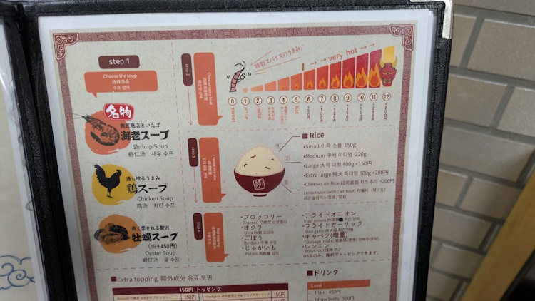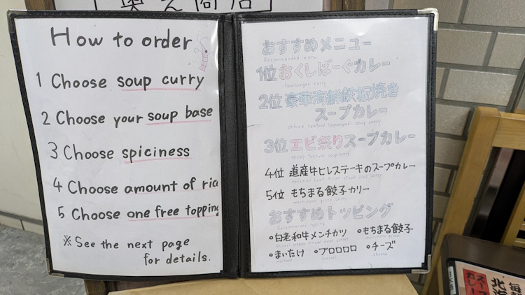 As I waited in line, I saw the familiar “how to order” instructions, coaching newbies on the classic format for soup curry consumption.