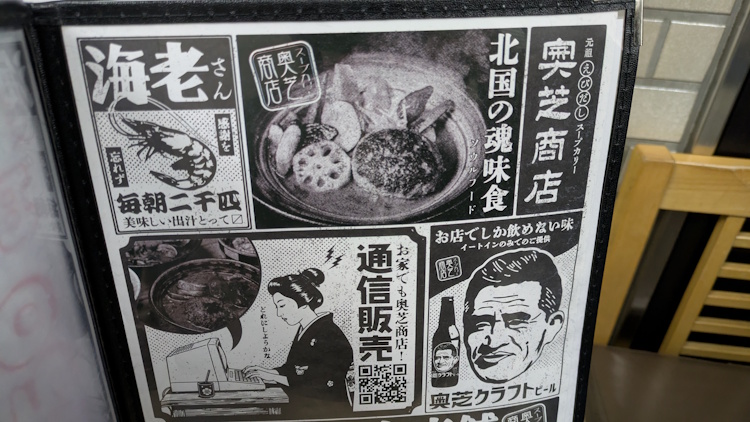 Okushiba Shouten features a Ebidashi extracted from 2,000 sweet prawns daily, which has been passed down for three generations.
