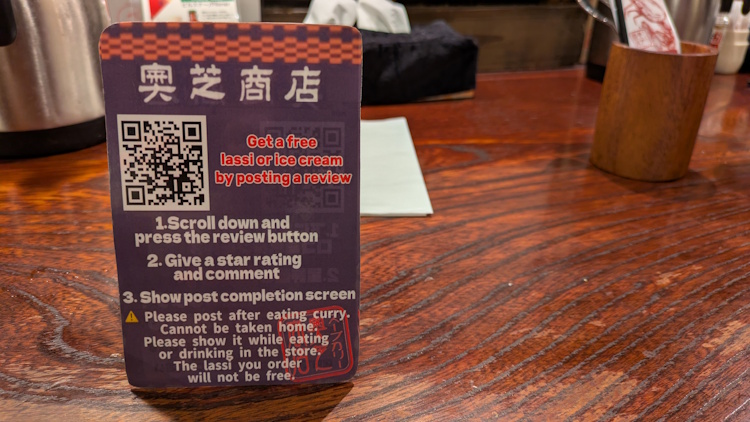 They also push you to leave a review, using a little sign to offer you a bribe (free lassi) if you do it.  When we did our review of 2Bro’s Pizza in Kobe, we called them out of the same kind of over-marketing (they try to bribe customers for reviews with a sticker).