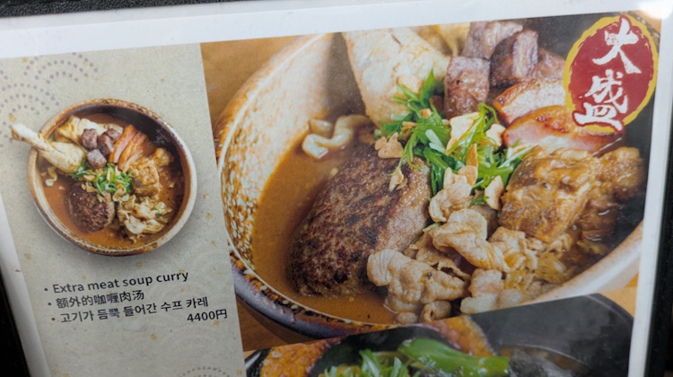 I did note that there was a Hamburger Soup Curry on the menu (2180 JPY) and (for the adventurous) a Natto Soup Curry (1580 JPY).  For the customer that really must spend as much as possible on lunch, there is the Extra Meat Curry for 4400 JPY.