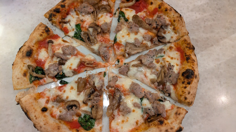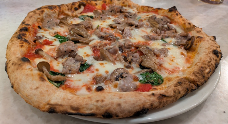 First bite: the warmth of the crust and cheese, then the earthiness of the spongy mushrooms, then the spicy bite of the sausage. Amazing. Finished with the taste of charred bits of the crust.