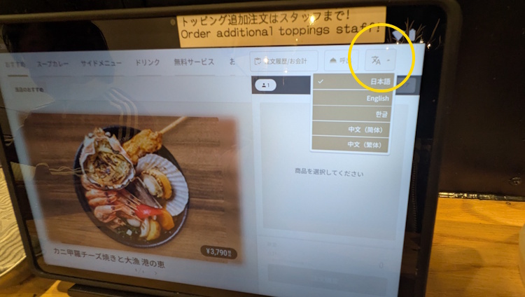 Look for the “Language” button in the upper right corner. The tablet menus at Garaku menus start off in Japanese, but offer service in English, Korean and Chinese.