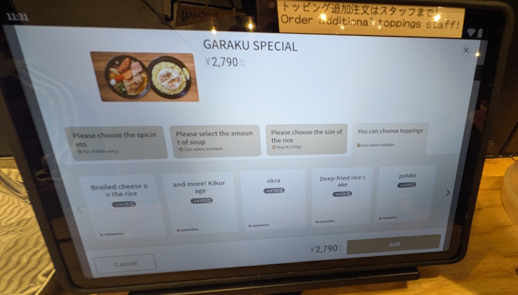 All of these screen-based menus are terrible, (Garaku’s physical menu is low-tech, and very easy to understand. And at the Garaku Sitatte store, you get to order with a real human.), but the menus at their Main store are not too difficult to use or understand, they are better than most. You may notice the “tabs” for 1. spiciness, 2. amount of soup, 3. size of rice, and 4. toppings.