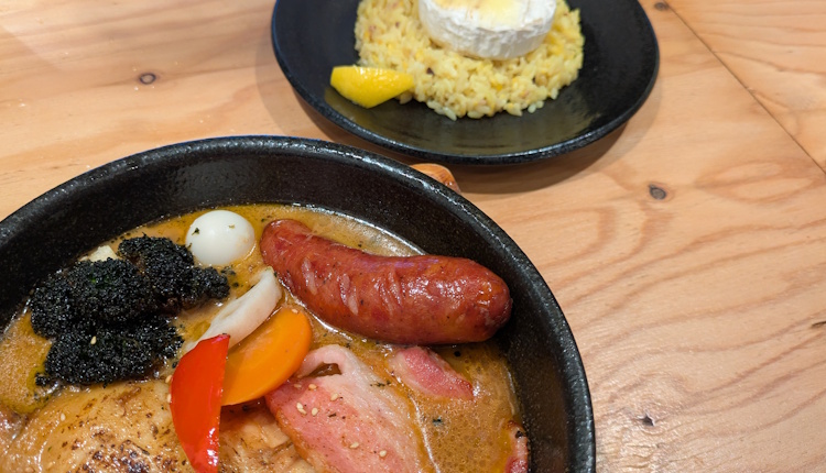 That description sounds like there might be cheese in the soup curry (which sounds good, actually), but the cheese comes separately on the rice. They have an additional option for a slice of cheese on the rice, but this is a small “wheel” of local-Hokkaido, French Camembert cheese.