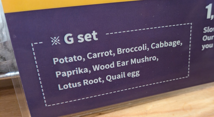 “G Set” is a somewhat cryptic way of announcing their lists of standard vegetables in the soup curry including Potato, Carrot, Broccoli, Cabbage, Wood Ear Mushro (which we can assume is in fact mushroom), Lotus Root (locally known as renkon), and the very non-vegetable Quail Egg.