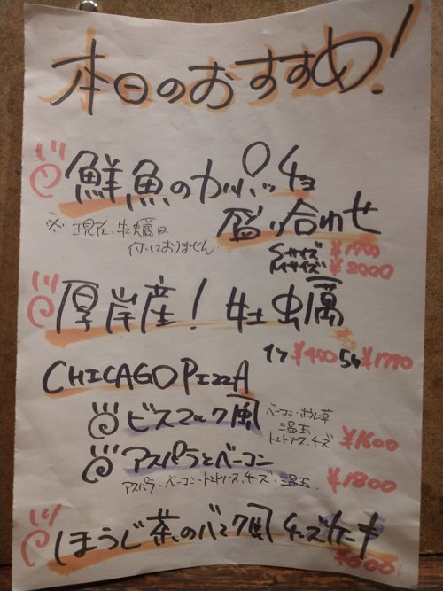 Here is a shot of their “specials.” We have confessed elsewhere (and we will again) that our skill with the Japanese language is not strong,. But even as a “warui gakusei” (bad student) I could read アスパうとべーこン – which we’ll take the risk and try to translate; it means something like “asparagus and bacon” pizza. We have had that one before (in their new style), and it’s pretty tasty.